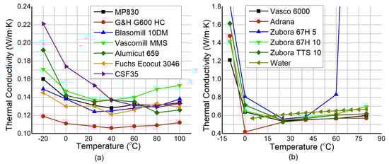 The assessment of thermal conductivity is presented in Figure 7. For the cutting oils (Figure 7a), the thermal conductivity in the temperature range from 0 to 100 °C was in the range of 0.10–0.18 W/(m⋅K). Below 0 °C, it could clearly be seen that the conductivity was higher, especially for Alumicut 659 and CSF35, which were the oils that experienced clear signs of the phase change process, as seen in the graph for the measurement of heat capacity (Figure 6a).