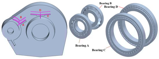 To enhance simulation efficiency, the gearbox geometry was simplified by omitting components with negligible effects on lubricant dynamics. As illustrated in Figure 1, the simplified model comprises a gearbox housing, a pair of helical gears, bearings, and oil-guide channels. The labeled oil-guide devices (A, B, C, and D) correspond to their respective bearing positions. During operation, lubricant is entrained by the driven gear’s rotation to lubricate the gear surfaces. A portion of the oil splashes into the guide channels and subsequently flows into the bearings.