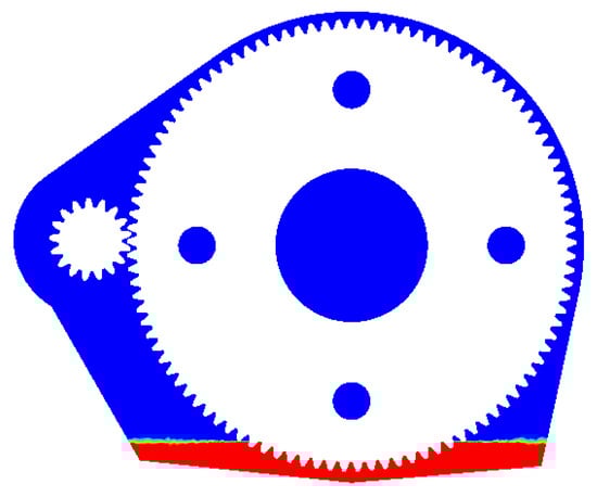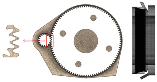 The gearbox internal flow field was modeled as a two-phase (air and lubricant) system. The lubricant (75W–90 grade) exhibits temperature-dependent viscosity, as follows: 1.65 Pa·s at −10 °C, 0.391 Pa·s at 10 °C, and 0.0286 Pa·s at 70 °C. Air properties were defined as a density of 1.225 kg/m3 and a kinematic viscosity of 1.56 mm2/s. The speeds of the wheels, driving wheels, and driven wheels are represented in Equation (1). The initial oil fill level was set to three times the gear tooth height, as shown in Figure 3, with gear/bearing rotational parameters adopted from [].
