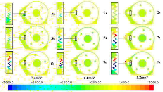 Pressure distribution of the gearbox cross-section at different accelerations.