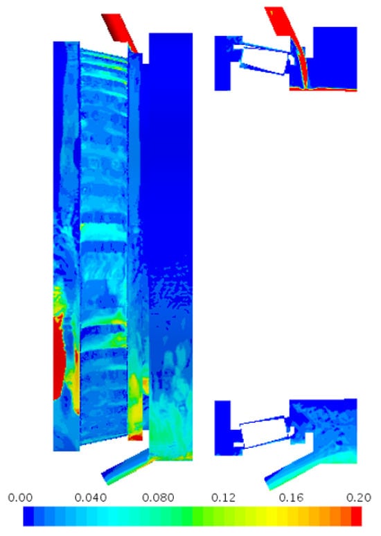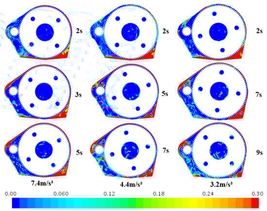 Figure 5 shows the cross-sectional pressure distribution of the gearbox during acceleration to 80 km/h at 7.4 m/s2, 4.4 m/s2, and 3.2 m/s2, followed by 2 s of constant-speed operation at an oil temperature of 70 °C. During the initial start-up phase, the internal pressure distribution remained uniform across all acceleration conditions. However, significant pressure differences were observed in the gear meshing area—approximately 3500 Pa at 7.4 m/s2, 2000 Pa at 4.4 m/s2, and 1000 Pa at 3.2 m/s2. These differences arise because higher initial accelerations generate greater gear line velocities, driving rapid lubricant displacement and increased flow rates in the meshing region. As the gears reached peak speed, pressure differences in the meshing region diverged inversely with acceleration—3500 Pa at 7.4 m/s2, 4500 Pa at 4.4 m/s2, and 8000 Pa at 3.2 m/s2. This reversal occurs because higher accelerations cause centrifugal forces to fling most oil toward the gearbox’s left wall (Figure 6), reducing oil supply to the meshing area (Figure 7) and thereby lowering pressure differences. After stabilizing at peak speed for 2 s, both pressure differences and lubricant distribution in the meshing area converged to similar levels.