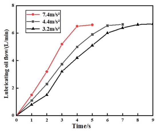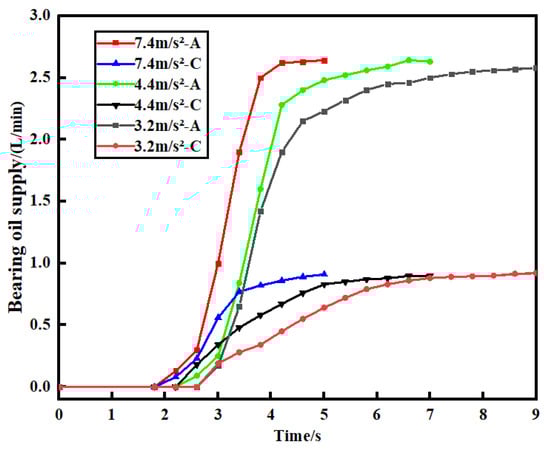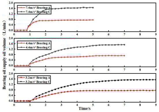 Figure 9 shows the transition in supply oil behavior under different acceleration levels. From Figure 9, it can be found that bearings initiate oil supply earlier under greater acceleration—with acceleration times of 3, 5, and 7 s, oil supply begins at 0.9 s, 1 s, and 1.2 s, respectively. During acceleration, faster growth rates in oil supply are observed with higher acceleration. For instance, under a 3 s acceleration, Bearing A stabilizes its oil supply in 2 s and Bearing C in 1.5 s, whereas a 5 s acceleration extends stabilization times to 4 s for Bearing A and 2.5 s for Bearing C. Further reducing acceleration to 7 s prolongs stabilization to 6 s for Bearing A and 4 s for Bearing C. Despite these dynamic variations, all bearings ultimately converge to a consistent steady-state oil supply range, demonstrating that acceleration impacts transient responsiveness but not final equilibrium.