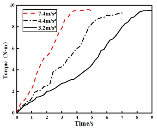Figure 8 compares the churning torque of the gear under different accelerations. During acceleration, higher accelerations produced larger churning torque values. However, once the gear transitioned to steady-speed operation, the torque stabilized to nearly identical levels across all acceleration conditions, indicating that acceleration primarily impacts transient dynamics rather than steady-state performance.