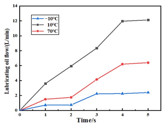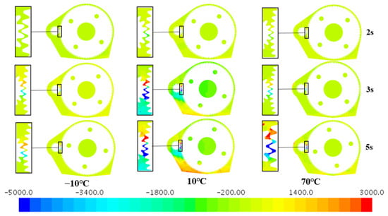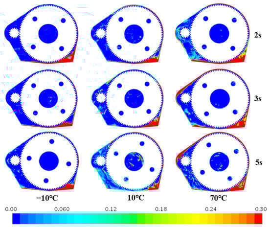Figure 11, Figure 12 and Figure 13 depict the evolution of pressure contours, flow field distribution, and lubricating oil volume in a gearbox under oil temperatures of −10 °C, 10 °C, and 70 °C, with an acceleration time of 3 s. In the initial phase, overall pressure distribution remains uniform across all temperatures, yet localized pressure differences in the gear meshing region intensify with temperature (e.g., they are highest at 10 °C). This is because more lubricating oil is entering into the meshing area at 10 °C. When the temperature is lower, the viscosity of the oil is larger and most of the oil is kept at the bottom of gearbox. However, if the temperature is higher, the viscosity of the oil is smaller and most of the oil is splashed onto the gearbox wall surface. As time progresses, the same trend is exhibited, as shown in Figure 11 and Figure 12. Ultimately, at 10 °C, the gear meshing area has the highest amount of lubricant oil.