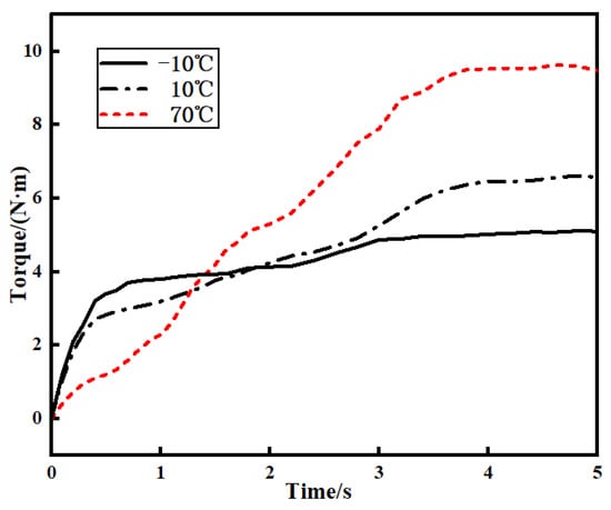 Figure 14 reveals the effect of temperature on churning loss. It can be found that churning torque initially increases and then stabilizes from acceleration to steady state for all temperatures. However, the lower the temperature, the larger the churning loss during the start-up phase. This is because, during initial start-up, the lubricant oil is deposited at the bottom of the gearbox and lower temperatures result in a higher viscosity, leading to increased agitation torque. Over time, as the oil gradually distributes within the gearbox, higher temperatures facilitate broader oil dispersion into the gearbox, thereby further elevating the torque. Consequently, the churning torque is highest under steady-state conditions at 70 °C, which aligns with Liu Hua’s experimental findings [].
