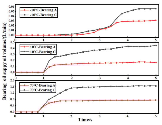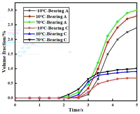 Figure 15 shows the variation in bearing supply oil volume at different temperatures. It can be found that across all temperature conditions, the oil supply exhibits an initial rapid increase followed by stabilization. Temperature significantly impacts both the start-up performance and final stable values of the lubrication system. At −10 °C, the oil supply grows most slowly, with a delayed initial supply time of approximately 2 s and a low stable value of 0.04–0.05 L/min for Bearing C, due to increased lubricant viscosity and reduced fluidity under low temperatures. When the temperature rises to 10 °C, the initial supply time shortens to 1 s and the stable value increases to 0.3–0.4 L/min for Bearing C, reflecting improved fluidity as viscosity moderates. At 70 °C, the system achieves optimal performance—the initial supply time drops to 0.8 s and the oil supply rapidly climbs to a high stable value of 1.6–2.0 L/min for Bearing C, benefiting from reduced viscosity and enhanced flow under elevated temperatures. In addition, Bearing A (red curve) and Bearing C (gray curve) share similar trends across temperatures, and Bearing A consistently maintains slightly higher stable oil supply values because of the different structural or lubrication channel designs. However, as shown in Figure 16, the final lubricant volume fraction inside Bearing A is higher than that in Bearing C, which is attributed to Bearing A’s smaller size. Additionally, the initial oil supply times for Bearings A and C are slightly reduced under varying temperatures. This is because in low-temperature conditions, although the oil supply at the inlet starts more slowly, once it enters the bearing chamber, it is rapidly carried into the bearing interior. In contrast, under high temperatures, the lubricant first flows along the wall to the bottom of the bearing chamber and is only drawn into the bearing interior after accumulating to a certain volume, as depicted in Figure 17.