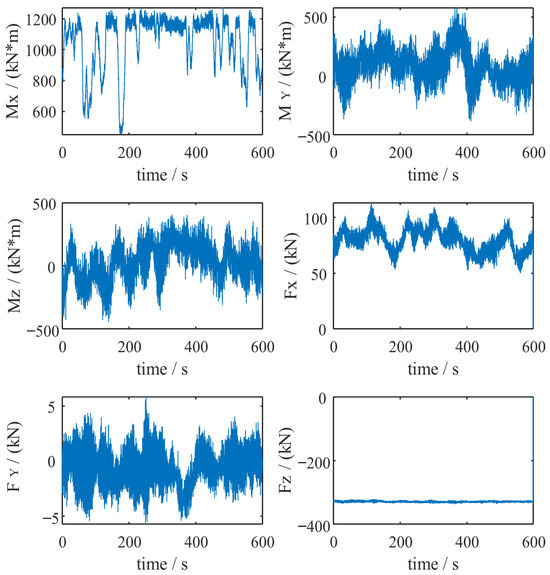 As the load data comprise over a hundred conditions, only the eight most frequent scenarios are calculated. These eight scenarios cover over 99% of the total operational probability for the entire 20-year lifespan of the machine [15]. The simulation results, as shown in Figure 2, indicate that the hub loads are alternating. These loads, when transmitted through the main shaft to the bearing, result in the bearing experiencing alternating loads as well.