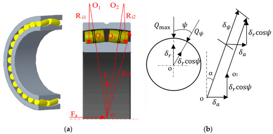 In Figure 3b, starting from the position of maximum roller load under the influence of Fr and Fa, ψ represents the position of the roller at any angle, α represents the contact angle, and δr and δa, respectively, represent the radial and axial displacements. The displacement when the inner ring operates relative to the outer ring is depicted as follows in Equation (9) [21]: