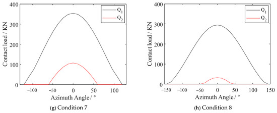 Figure 11 illustrates the contact stress distribution contours at the roller–inner race and roller–outer race interfaces, computed using the proposed computational method under eight operating conditions (Conditions 1–8). In each contour plot, the color bar on the left-hand side transitions from red to blue, indicating a decreasing gradient of contact stress values.