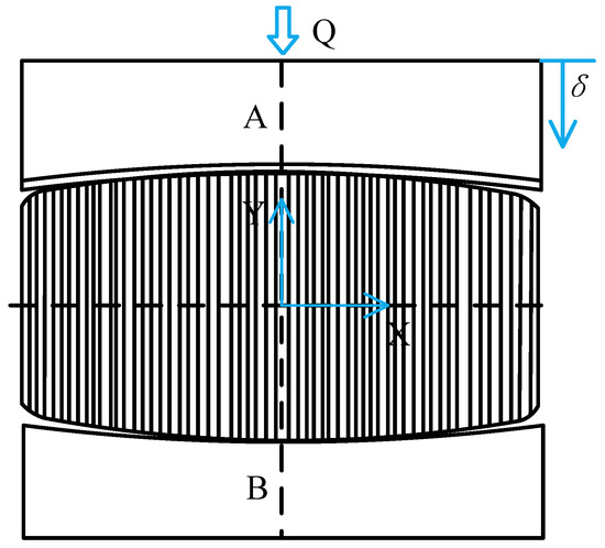 As depicted in Figure 5, the roller has a diameter d, length l, and a radial clearance c. The profile radius R of the roller is approximately equal to Ro. The load Q is applied at position A, and A moves relative to B, with a total displacement distance of δ. δA is the distance of the roller movement, ciA is the initial movement gap between the roller and the raceway, and σiA is the deformation during contact, δB, ciB, and σiB are the geometric parameters. The load–displacement relationship is derived from the following Equation (26) [9]: