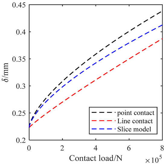 In combination with Table 4, the load–displacement relationship curve in Figure 6 is obtained. When the load is small, the contact form exhibits point contact characteristics. As the load increases, the contact form gradually approaches line contact. This indicates that the contact characteristics of the bearing change with the magnitude of the load [33]. These patterns aligns with the descriptions the in literature [16]. The load–displacement relationship data will serve as the boundary conditions for the finite element simulation in the next section.