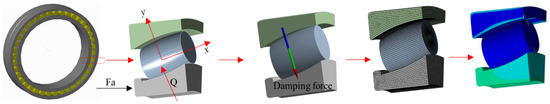 - The friction coefficient is set at 0.05. Due to the presence of radial clearance, the “PINB” command in the finite element software is used to close the initial gap. To ensure convergence, artificial damping forces are added in the form , where L = 0.002, representing the damping coefficient. The load is incrementally applied according to time steps, and the damping force is proportional to the velocity. Initially, the roller moves at a high speed, and the presence of the damping force prevents computational divergence. After a period, once the roller contacts the raceway, the damping force becomes zero, not affecting the results.