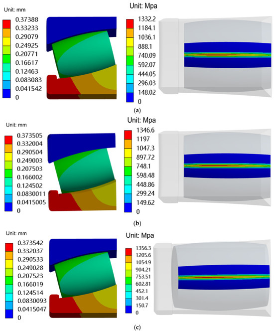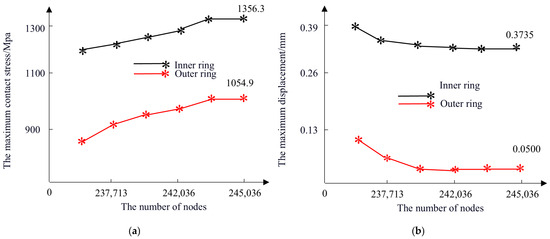 As illustrated in Figure 9a,b, which depict the relationships between the number of nodes and both contact stress and displacement in simulations using hexahedral elements, it can be observed that when the node count approaches 245,036, both the maximum contact stress and maximum displacement tend to stabilize. Therefore, a node count of 245,036 is deemed optimal.