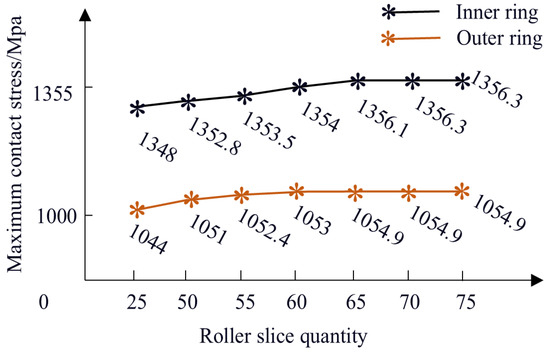 The number of roller slices has an impact on the calculation of contact stress. Too few slices can lead to smoothing of the stress concentration area, while too many slices can increase the computational cost. Therefore, it is necessary to determine the number of roller slices reasonably to ensure that the maximum value of the contact stress does not fluctuate significantly with the increase in the number of slices. Taking Condition 7 as an example, as shown in Figure 10, the number of roller slices and the maximum contact stress are shown. When the number of roller slices is 70, the maximum contact stress of the inner ring converges to 1356.3 Mpa, and when the number of roller slices is 65, the maximum contact stress of the outer ring converges to 1054.9 Mpa. Therefore, the number of roller slices is selected to be 70.