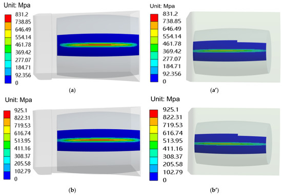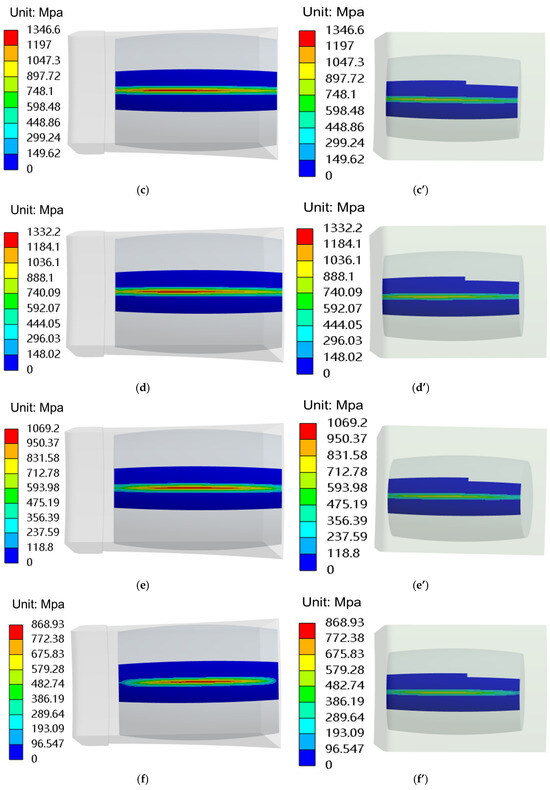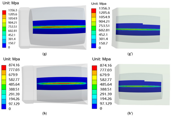 Contact stress. (a) Condition 1: the contact stress of the inner ring; (a’) Condition 1: the contact stress of the outer ring; (b) Condition 2: the contact stress of the inner ring; (b’) Condition 2: the contact stress of the outer ring; (c) Condition 3: the contact stress of the inner ring; (c’) Condition 3: the contact stress of the outer ring; (d) Condition 4: the contact stress of the inner ring; (d’) Condition 4: the contact stress of the outer ring; (e) Condition 5: the contact stress of the inner ring; (e’) Condition 5: the contact stress of the outer ring; (f) Condition 6: The contact stress of the inner ring; (f’) Condition 6: the contact stress of the outer ring; (g) Condition 7: the contact stress of the inner ring; (g’) Condition 7: the contact stress of the outer ring; (h) Condition 8: the contact stress of the inner ring; (h’) Condition 8: the contact stress of the outer ring.