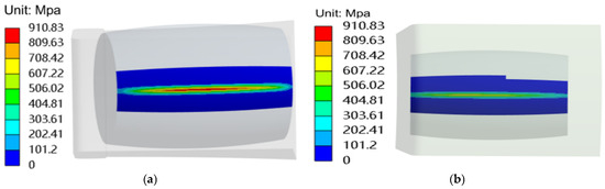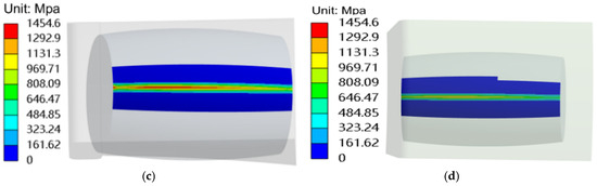 - Figure 12a,b show the inner and outer ring contact stresses for Condition 1, which are 910.83 MPa and 607 MPa, respectively. Figure 12c,d depict the inner and outer ring contact stresses for Condition 7, which are 1454.6 MPa and 969 MPa, respectively, with the maximum contact stress being 1454.6 MPa.