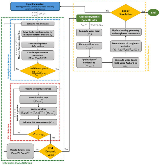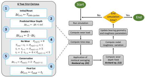 The algorithm begins with setting up the simulation model by inputting parameters such as the lubricant and geometry characteristics, bearing stiffness, roughness, boundary conditions, and bearing speed and load. The boundary conditions are updated in each iteration, where the wear model computes the time step and wear based on tribological interactions from the mixed EHL simulation. Various wear prediction models utilize empirical and numerical methods, often relying on data for the sliding speed, temperature, load, and material properties. This work employs Archard’s model to predict the local wear depth, integrating a new formulation [59] to factor in the energy required for material removal during stable wear. Key variables include the hardness of the softer material H, the wear intensity constant K, the local friction power per area , and the contact duration ∆t. The final equation for the wear depth is then calculated at each computational mesh node: