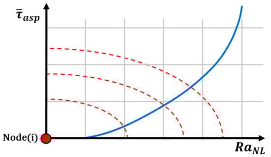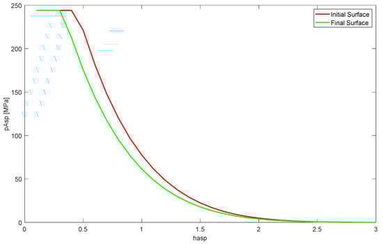 The wear load at every node is evaluated according to this expression, where is the nonlocal wear load and is the local value. As indicated in Equation (14), the averaging procedure is driven by the nonlocal weight function , whose value decreases with the distance to the evaluated point . Therefore, a specific radius of influence is considered to affect the neighbourhood of a particular node, and all neighbouring nodes are assigned a ratio indicated by the weight function. This work proposes a more specific treatment of the radius of action as the function of a local variable related to the rough contact mechanics behaviour of the bearing. The variable selected was the asperity shear stress, defined as the asperity pressure times the boundary coefficient of friction . This variable was made dimensionless to ensure a manageable range using the Hertz shear stress as the reference value characteristic of the material. Accordingly,