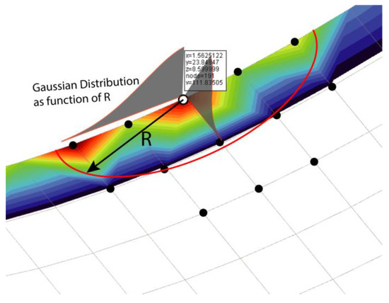 A graphical illustration of the nonlocal method is depicted in Figure 6 to enhance understanding. An example of the connecting rod bearing is shown in detail without any result preprocessing, where the wear load contours are shown over the bearing mesh. The influence area is represented by a red line forming the local ellipse shape, where the wear load is distributed in the neighbouring nodes coloured in black with a Gaussian weighting function. To ensure a correct distribution, the area was adjusted to the bearing edges based on the limit, as indicated in Equation (22).