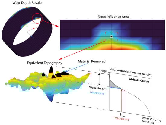To address this issue, the authors propose a method to link the material removal across scales. Each macro node corresponds to a specific area of influence for the wear, and an equivalent microscale topography is adjusted to reflect the predicted material loss. This correlation utilizes a multiscale parameter, the wear volume per area, connected via the volume distribution by height curve, known as the Abbott curve [60].