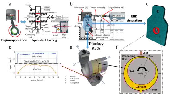 Case study illustration: (a) real engine application and test rig selected; (b) detailed scheme of test rig; (c) connecting rod finite element model; (d) experimental measurement of bearing axial profiles, before and after wear cycle; (e) interaction of parts selected for tribology study; (f) lubrication scheme of connection rod journal bearing.