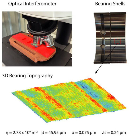 Journal bearings are widely used in industrial machinery, internal combustion engines (ICEs), power generation turbines, and other applications due to their high load-carrying capacity, low friction, noise and vibration reduction, ability to accommodate shaft misalignment, and long service life at moderate to high rotational speeds. This study evaluated the effectiveness of the proposed wear model in predicting wear in ICE journal bearings, where lubricant rheology plays a critical role due to the high shear stress and film pressures involved [24,25,26,27,28]. Consequently, the lubrication regime and bearing performance are significantly influenced by the rheological properties of the lubricant and surface roughness characteristics.