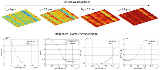 Surface characterization is critical to obtain the roughness parameters at different wear stages. A method developed by the authors [61] is to obtain specific Greenwood–Tripp [51] roughness parameters from every surface topography (see Figure 8), where the asperity pressure is calculated using a statistical approach that accounts for the asperity density, the asperity peak radius of the curvature, the standard deviation of the asperity height, the contact area, the composite elastic modulus, the surface separation, and the integral function related to the asperity height distribution (see Section 2.1.5).