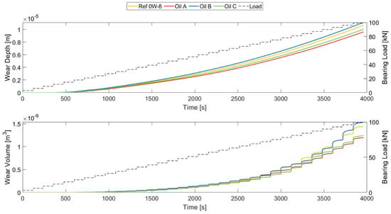 A brief explanation of the wear load and time step highlights the dependence of the variables included in Archard’s equation for wear depth prediction. The new proposed approach assumes that the material removal rate remains constant during a certain period, (the time step). This enables the consideration in the model of the average wear load during this period, which represents the local rate of the friction energy loss per area. The average wear load is defined in Equation (13) and depends on the asperity contact pressure , the relative velocity between the surfaces , and the shaft rotation period under stable wear conditions.