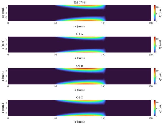 After reaching the steady-state and EHL solutions, the process of obtaining the iterative wear solution started immediately, as this case study was set up with a static load and the external forces did not evolve over time. The wear algorithm calculated the corresponding wear load and time step and applied the nonlocal function to the wear load field. Then, the wear depth field was computed using Archard’s equation, and the multiscale roughness model was used to calculate the variation in the Greenwood–Tripp roughness parameters at the microscale based on the wear depth predicted at the macroscale. Once these subroutines were finished, the bearing geometry, roughness parameters, and operating conditions were updated in the next iterative cycle.