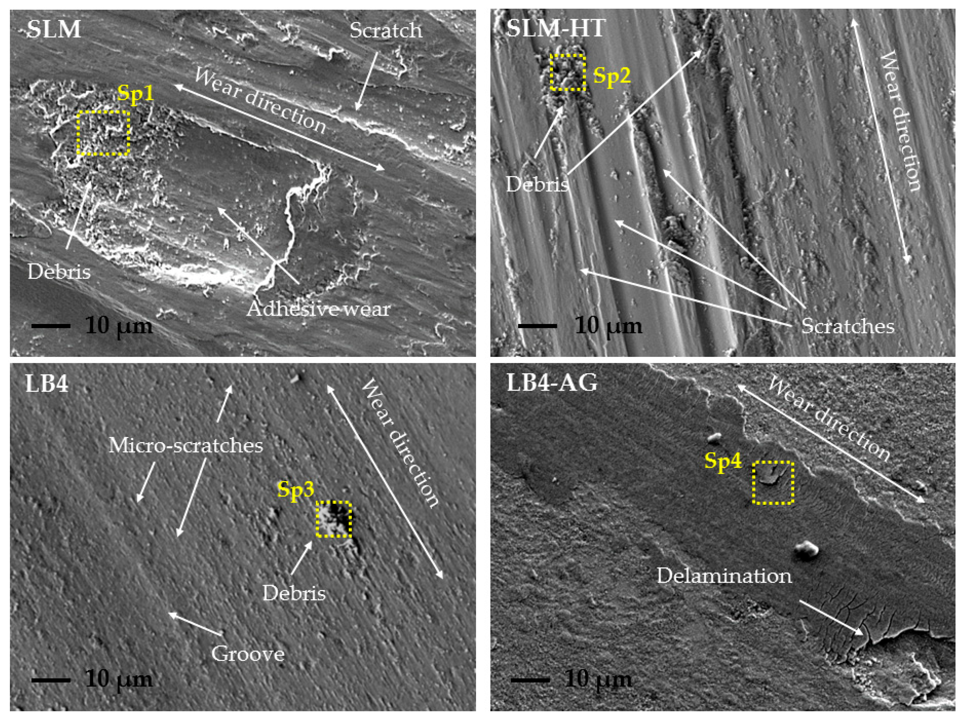 Figure 12, SLM-HT), while scratches and grooves present mainly indicated the transition to a deformative–abrasive wear mechanism. At the same time, the coefficient of friction was slightly reduced and wear resistance improved by ~2.9 times.