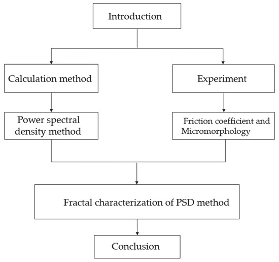 Based on the above research findings, there exists a certain correlation between the fractal dimension and surface roughness of friction interfaces. Meanwhile, studies on the three-dimensional microscopic fractal characteristics and evolution patterns of piston rings and cylinder liners under varying operating conditions remain relatively scarce. Currently, there are limited investigations employing power spectral density (PSD) methods to analyze piston rings while simultaneously considering fractal parameter variations under multiple operating conditions involving temperature and pressure changes. To investigate the influence of different operating parameters on surface microtopography in cylinder liner–piston ring friction pairs under various working conditions, this study adopts a sectioned specimen testing approach. High-temperature tribological experiments are conducted under different temperature and pressure conditions to obtain the friction coefficient data and microscopic morphology characteristics of the friction pair. The three-dimensional surface topography is processed using power spectral density analysis, combined with fractal model fitting, to study the evolution patterns of microtopography with the operating parameters. Figure 1 shows the schematic diagram of the research approach in this paper.