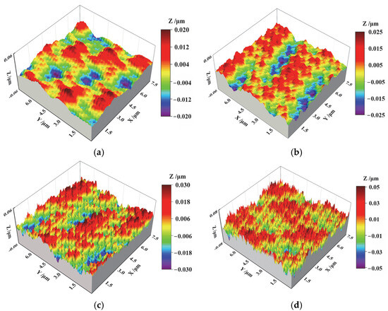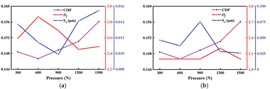 Figure 7 and Figure 9 primarily compare the friction coefficient, fractal dimension, and surface roughness. Among these, the friction coefficient is not only related to the morphological characteristics but is also influenced by the lubricant properties. Thus, it does not exhibit a direct correlation with the other two parameters. In contrast, the fractal dimension and surface roughness, both being morphological characterization parameters, demonstrate a certain degree of correlation. The experimental results reveal an approximately inverse relationship between roughness and fractal dimension. When the roughness is higher, the peaks and valleys of the microscopic surface become more pronounced, indicating distinct local features. The fractal dimension, on the other hand, reflects the self-similarity of the surface—the consistency between local and global characteristics. When the local features are more prominent, the fractal dimension tends to be lower.