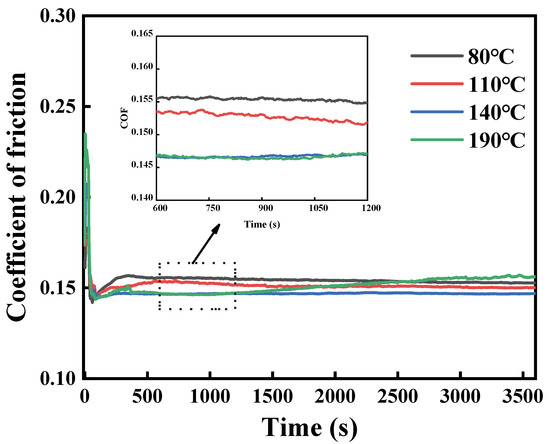 Based on the above experimental phenomena, the average value of the coefficient of friction, calculated from the data within 600 s to 1200 s at the beginning of the experiment, was chosen as the typical data for characterizing the coefficient of friction at the corresponding temperature. The COFs in this region are shown in Table 4.