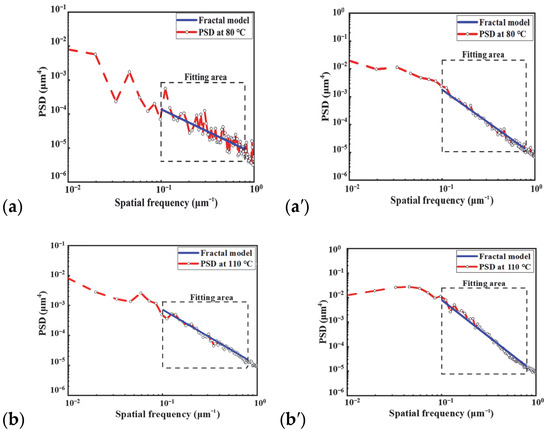 Figure 8. Evolution of spectral power density with the spatial frequency of micromorphology measured at different frictional temperatures. The red line represents the power spectral density at the corresponding temperature. The blue line indicates the fractal fitting, and the dashed area marked in the graph denotes the fitting region. (ad) Cylinder liners and (a′–d′) piston rings.