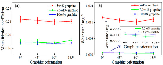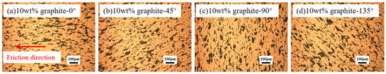 Figure 3a shows the hardness variation curve of copper–graphite composites at different graphite orientations. As seen in the figure, the hardness of the material first increases and then decreases as the graphite orientation increases. As the graphite content increases, the hardness of the material gradually decreases. When the graphite angle is 90°, the hardness of all the materials is at its highest. The author believes that this is because the area proportion of graphite on the surface affects the hardness, and the area proportion of graphite on the material’s surface is minimal when the graphite orientation is 90°.