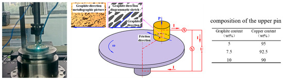 Copper–carbon composites, commonly used as current-carrying friction materials, are extensively applied in various fields such as switch contacts, motor brushes, and contact line/sliding plate systems [1,2,3]. With the advancement of technology, the service conditions of copper–carbon composites have become increasingly demanding, and the operating environments have grown more complex. For example, with the rapid development of high-speed rail, friction materials such as pantograph sliding plates are required to withstand higher speeds and electrical current loads, with speeds exceeding 300 km/h and maximum current loads exceeding 1000 A [4,5]. Therefore, further investigation of the service performance of copper–carbon composites is urgent [6,7].