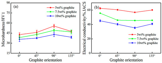 Figure 3b shows the electrical conductivity variation curve of copper–graphite composites at different graphite orientations. The figure shows that as the graphite orientation increases, the electrical conductivity of the material first decreases and then increases. As the graphite content increases, the electrical conductivity of the material gradually decreases. When the graphite orientation is 90°, the electrical conductivity of all the materials is at its lowest (since the eddy current method was used for testing in this experiment, when the graphite orientation is 90°, the flake graphite in the vertical direction is the greatest obstruction to the testing eddy current, resulting in a lower electrical conductivity).