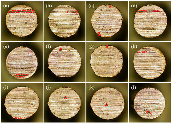 Macro photos of the wear surfaces of the pin samples: (a) 0° (5 wt% graphite); (b) 45° (5 wt% graphite); (c) 90° (5 wt% graphite); (d) 135° (5 wt% graphite); (e) 0° (7.5 wt% graphite); (f) 45° (7.5 wt% graphite); (g) 90° (7.5 wt% graphite); (h) 135° (7.5 wt% graphite); (i) 0° (10 wt% graphite); (j) 45° (10 wt% graphite); (k) 135° (10 wt% graphite); and (l) 135° (10 wt% graphite).