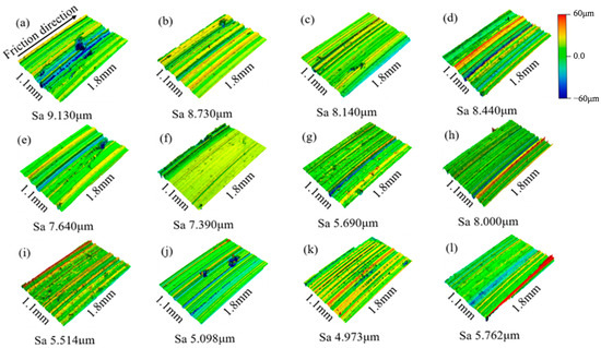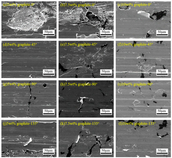 Three-dimensional morphology of the wear surfaces of the pin samples: (a) 0° (5 wt% graphite); (b) 45° (5 wt% graphite); (c) 90° (5 wt% graphite); (d) 135° (5 wt% graphite); (e) 0° (7.5 wt% graphite); (f) 45° (7.5 wt% graphite); (g) 90° (7.5 wt% graphite); (h) 135° (7.5 wt% graphite); (i) 0° (10 wt% graphite); (j) 45° (10 wt% graphite); (k) 135° (10 wt% graphite); and (l) 135° (10 wt% graphite).
