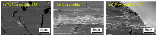 Figure 8 shows SEM images of the worn surfaces of materials with different graphite contents and angles. The worn surface is primarily characterized by furrows, along with adhesive tearing, exfoliation pits, and arc erosion features. Further analysis shows that there are two sizes of exfoliation pits [22,23,24]. One type is deep exfoliation pits (as shown in Figure 8a, with a diameter of about 150 μm, where arc erosion occurs within the pit), which form due to poor interfacial bonding of the material and are primarily found on wear surfaces with a graphite orientation of 0°. The other type is shallow exfoliation pits (as shown in Figure 8c, with a diameter of about 30 μm); the author believes the formation mechanism is as follows: during the furrow process, the metal material undergoes plastic deformation and then fractures, the fractured part cannot bond with the matrix due to the presence of graphite, leading to its detachment and the formation of the exfoliation pit. Additionally, as the graphite content increases, both the depth and diameter of individual delamination pits on the wear surface decrease. Deep delamination pits were observed on the wear surfaces of composites with 5 wt% and 7.5 wt% graphite content and an orientation angle of 0°, while only shallow delamination pits were observed on other materials. As the graphite orientation increases, the wear surface gradually becomes smoother, with the total area of shallow delamination pits first decreasing and then increasing, reaching its minimum at a 90° orientation.