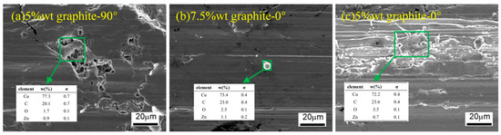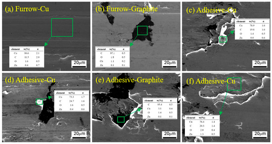 Figure 11 shows the graphite content on typical mechanical wear surfaces [22,27,28]. Figure 11a,b show the elemental content in the metal and graphite regions under the furrow morphology, with further statistical analysis indicating that the graphite content in the graphite region under the furrow morphology is in the range of 95.6 wt%~97.1 wt%, while the graphite content in the copper region under the furrow morphology is in the range of 10.4 wt%~17.1 wt% across three experimental materials and four graphite orientations. Figure 11c,d show the graphite content on the folded surface after adhesive tearing, with further statistical analysis indicating a graphite content between 19.8 wt% and 24.7 wt%. Figure 11e,f show the graphite content in the exposed area after adhesive tearing, where the graphite content in the graphite region is similar to that in the graphite region under the furrow morphology, and the graphite content in the copper region is between 17.8 wt% and 21.4 wt%. The results of the surface graphite content show no obvious relationship with the graphite content and graphite orientation in the bulk material.