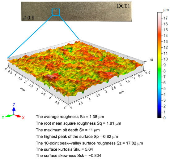 Topography of the sheet metal and selected roughness parameters of the DC01 sheet metal.