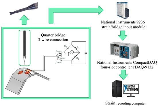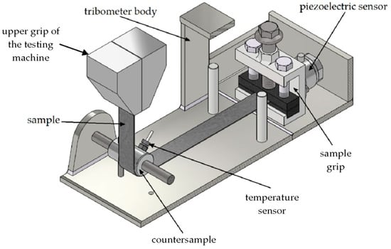 A self-developed friction tribometer (Figure 2) was used in the BUT friction tests. Its detailed design is presented in the paper []. In the BUT friction test, one of the ends of the strip sample is fixed, and a displacement is applied to the other end of the sample. The tribometer was mounted in the lower grip of the Zwick/Roell Z100 (Zwick/Roell, Ulm, Germany) testing machine, which is responsible for stretching the sample and recording the front-tension force. The back-tension force was measured using a Kistler type 9345B piezoelectric sensor (Kistler, Winterthur, Switzerland) (Figure 3). NI 745691-02 (National Instruments, Austin, TX, USA) temperature detector (Figure 2) was used to measure temperature.