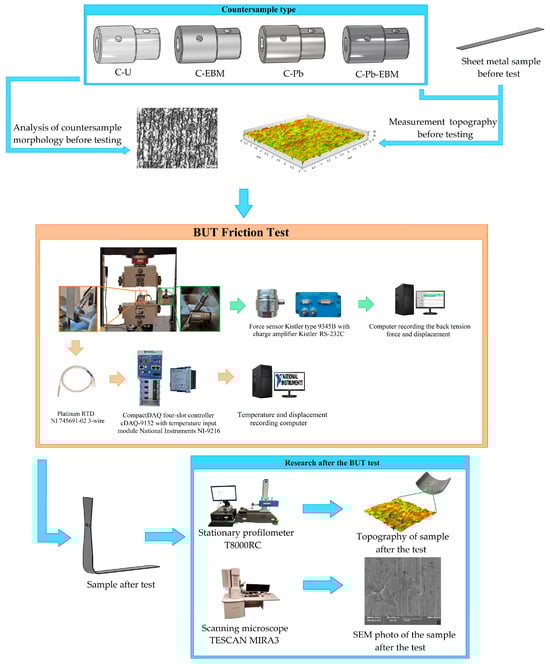 In this paper, for the first time, the results of strain-induced and friction-induced residual stress analyses in bending under tension friction test of low-carbon deep-drawing DC01 steel sheets are presented. Different surface morphologies of 145Cr6 tool steel countersamples were considered. Electron beam melting, lead-ion implantation (LI), and a combination of these two techniques were used to modify the surface layer of countersamples. Furthermore, the influence of BUT test conditions on the resulting surface topography of the sheets and CoFs was also investigated. The results provide a broader knowledge of the stress conditions occurring during sheet deformation at the rounded edges of tools in SMF.