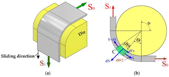(a) A strip of sheet metal wrapped around a cylindrical countersample and (b) the distribution of forces acting on an elementary section of the sheet metal.