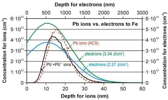 Figure 7 and Table 4 present the results of the modelling of the depth profiles for implanted ions and the introduced electrons to the iron substrate without taking into account the sputtering phenomenon. All presented profiles have a shape close to a Gaussian curve, also known as the normal distribution or bell curve, and can be simply defined with three main parameters, i.e., the peak volume dopant/electron concentration, the projected range, and the range straggling. The values of the skewness and the kurtosis were calculated for the ion profiles. Additionally, the theoretical values of the sputtering yield were shown. In the case of Pb ions, the values for the ACS profile were presented in round brackets.