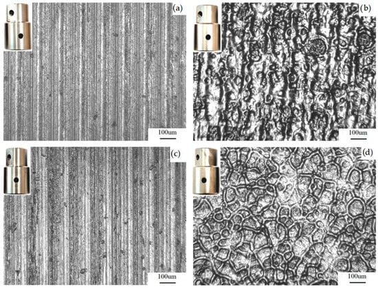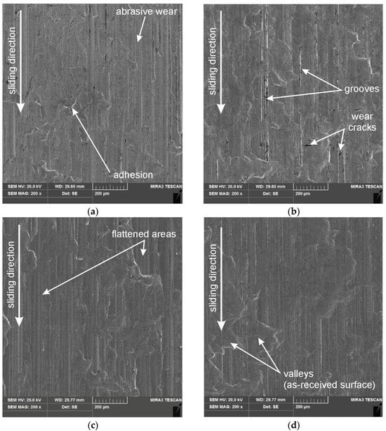 The surfaces of the C-Pb and C-U CSs are characterised by a smooth, directional structure (Figure 8a,c) resulting from the manufacturing process (turning). Due to the modification method, the surface of the EBMed countersamples (Figure 8b,d) is characterised by an uneven structure resulting from the solidification of the melted material. In contrast to other types of countersamples, the surface of the C-EBM and C-Pb-EBM countersamples contains many deep valleys, which in lubricated conditions can be considered as “oil pockets” []. The small real contact area is associated with the large number of valleys. The surface morphologies of the CSs are presented in Figure 9.