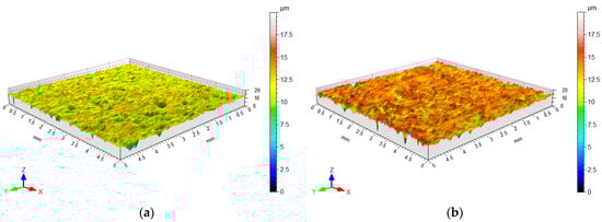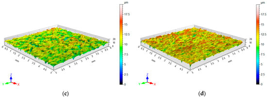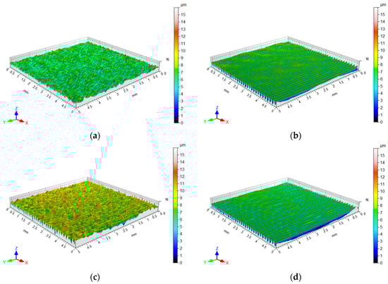 The surface topography analysis of the test material was performed using a stationary profilometer T8000RC manufactured by Jenoptik AG (Jena, Germany). Table 2 lists the basic parameters of the surface roughness measurement methodology. The measurements allowed for determining the surface topography of the sheet metal (Figure 1), and the basic values of 3D surface roughness parameters were determined. The basic parameters of 3D surface roughness were determined according to the EN ISO 25178-2:2022 [] standard. A Sku value > 3 (5.04 μm) indicates that the bearing area curve is characterised by less flatness than the normal distribution and has relatively many high peaks and shallow valleys. A negative skewness value characterises a surface with shallow, deep valleys.