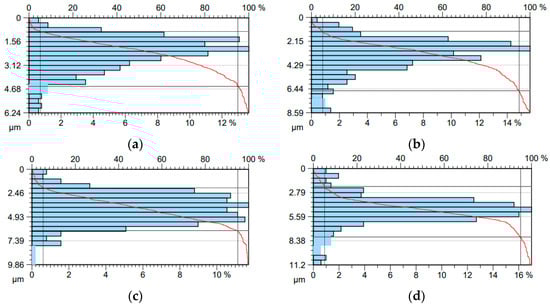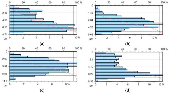 Figure 10 shows the bearing area curves (BACs) obtained after the surface modification process of the countersamples. BAC, also known as the Abbott–Firestone curve, is a method of describing the variation of the profile properties that change with its depth. The BAC indicates the percentage of a surface’s area that is in contact with a given depth. The horizontal axis represents the load-bearing coefficient in percentage terms, while the vertical axis represents the depth determined in measurement units (Figure 10). Based on BACs, reduced height of peaks Rpk and valleys Rvk, core peak-to-valley height Rk, and the smallest (Mr1) and the highest (Mr2) ratios of the roughness core profile were calculated (Table 6).