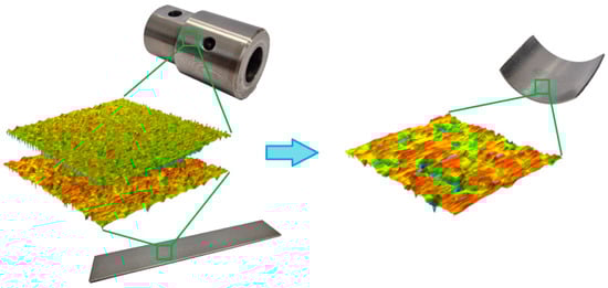 Reduced peak height, Rpk characterises the part of the surface that is abraded during the running-in period. Therefore, this parameter can be treated as a measure of resistance to abrasive wear []. The lowest value of reduced peak height Rpk calculated for the surface of the C-Pb countersample (Table 6) indicates its increased resistance to abrasive wear in comparison to the other materials. Core peak-to-valley height Rk can be considered as a parameter informing about the height of surface asperities after the running-in period. Based on the core peak-to-valley height Rk values for the tested countersamples, it can be concluded that the load-bearing capacity of the C-EBM surface after the running-in period is higher than that of the C-Pb-EBM surface. Reduced valley depth Rvk is a measure of the surface ability to retain lubricant in the surface valleys. For the analysed surfaces, the value of this parameter reached the highest value for C-Pb-EBM. Figure 11 schematically presents the process of evolution of the surface topography of the sheet metal strip in the BUT test. Under the influence of contact pressure, the summits of asperities are flattened. At the same time, as a result of large plastic deformations, the strength of the sheet material increases through the work hardening phenomenon, and the topography of the sheet surface is subject to strain-induced continuous evolution.